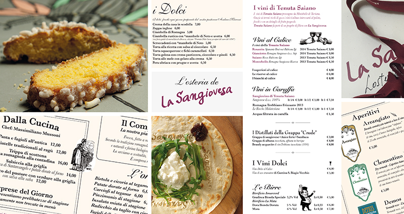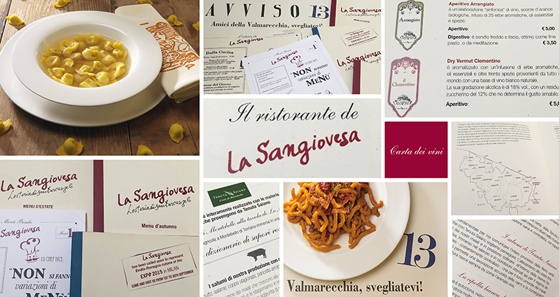 il ristorante La Sangiovesa è il contenitore della Romagna, del dialetto, del cibo romagnolo con qualche eccezione alla regola,dentro questo contenitore troviamo Tenuta Saiano, l’oasi di Montebello, di cui avevo curato 5 anni prima, lo start-up con logo ( foglia lanceolata di bosco, tipica delle stampe romagnole) e payoff l’oasi di Montebello.